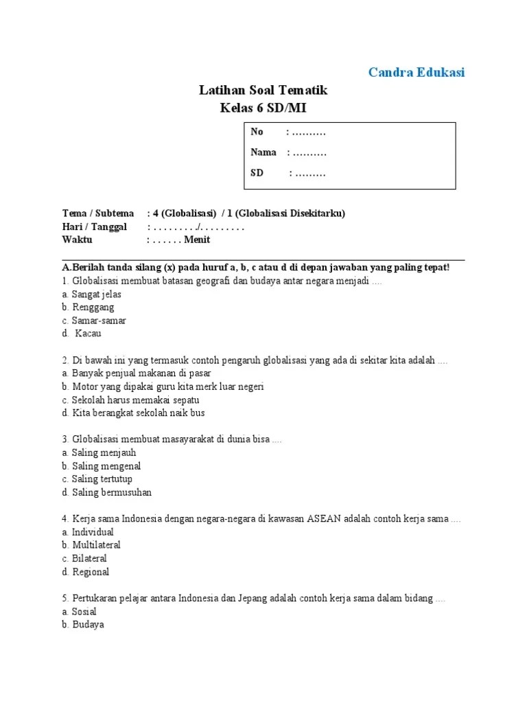 Halo sahabat ahzaa, pada post kali ini kita lanjutkan lagi pada latihan soal kelas 6 (enam) sd/ mi semester 1 (satu) tematik yaitu tema 4 . Play this game to review undefined. Berikan tanda silang (x) pada jawaban yang benar ! Adik adik kelas vi sd/mi, yang sedang mencari soal soal untuk dijadikan sebagai latihan, nah kebetulan kali ini kakak menyediakan soal tersebut untuk adik . Terdapat beberapa soal pada buku tema 4 subtema 2 kelas 6 sd buku tematik terpadu kurikulum 2013 mulai dari halaman 91 92 94. Silahkan langsung simak contoh soal uas / pas kelas 6 tema 4 kurikulum 2013 revisi 2018 dibawah ini: Subtema 1 penemu yang mengubah dunia, subtema 2 penemu dan manfaatnya, subtema 3 ayo, menjadi penemu; Globalisasi di sekitarku (sub tema 1). Beli soal tema 4 kelas 6 online berkualitas dengan harga murah terbaru 2020 di tokopedia! Tema 3 tokoh dan penemuan yang terdiri dari : Materi soal diambil dari subtema globalisasi di sekitarku yang merupakan bagian dari tema 4 kelas 6, globalisasi. Sedangkan untuk contoh selanjutnya kami bagikan soal tematik ipa kelas 6 tema 4. Buku latihan soal atau lks matematika kelas 6 sd semester 2 dilengkapi .